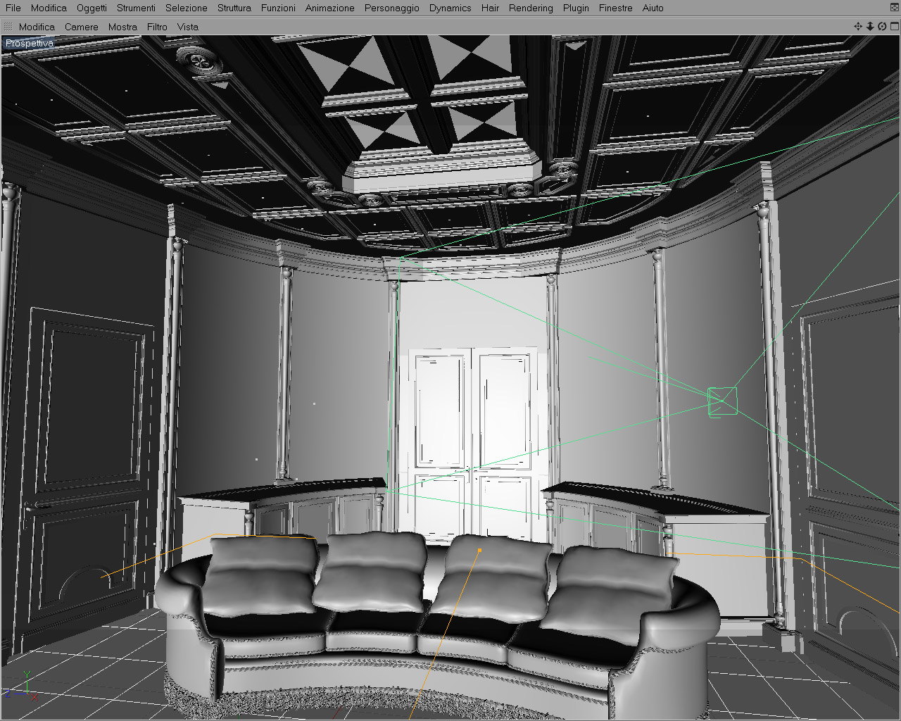 la mia prova sarà la seguente: farò un render del soffitto a camera parallela, cosi da poter mettere il render ricavato sul cielino che successivamente in scena alleggerirò di tutte le sagome. terrò solo la doppia altezza. la mappa di bump la farò con i livelli di cinema.