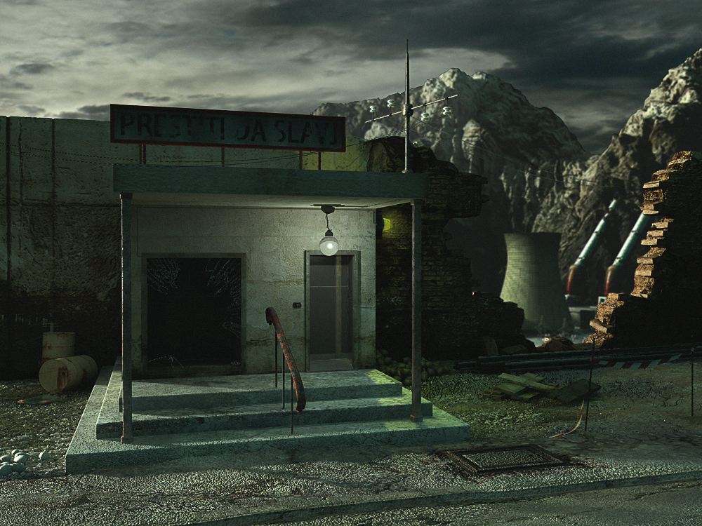 La centrale nucleare è in scena assieme a tutto il resto, ho posizionato prima lei, con un'inclinazione che ci facesse vedere la ciminiera, i tubi metallici e le torri elettriche, ... una volta trovato il taglio ho posizionato il monte, anche in quel caso cercando un profilo che mi suonasse bene.