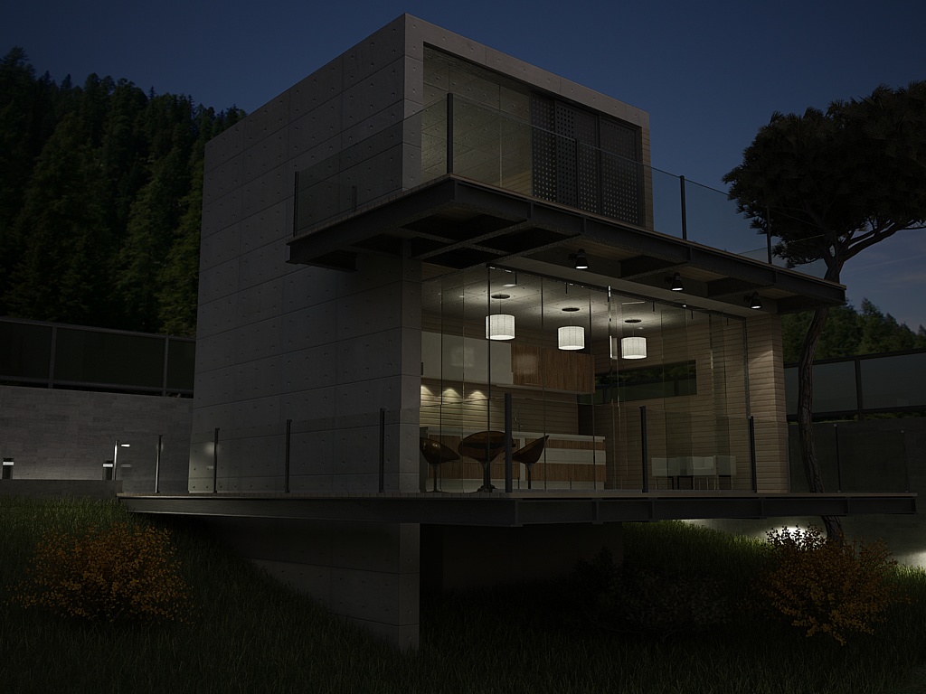 Io quindi, se fossi in te, alzerei ancora i valori delle luci interne xchè x me sono troppo deboli (oltretutto 3 lampadari al soffitto con una sfilza di dicroiche ad incasso, in un ambiente così, produrrebbero un bel pò di lumen). Anzi... potrebbe anche essere che una vetrata così grande con una bella luce interna illumini anche una porzione di prato antistante.... :?