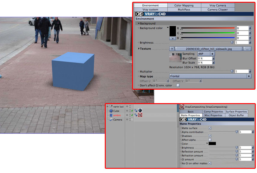 Il problema che lo "sfondo compositing" risolve sono le ombre proprie degli oggetti: si può assegnare a qualsiasi oggetto in qualsiasi modo inclinato la texture sfondo in modo che gli oggetti non subiscano l'illuminazione a seconda della propria inclinazione.
