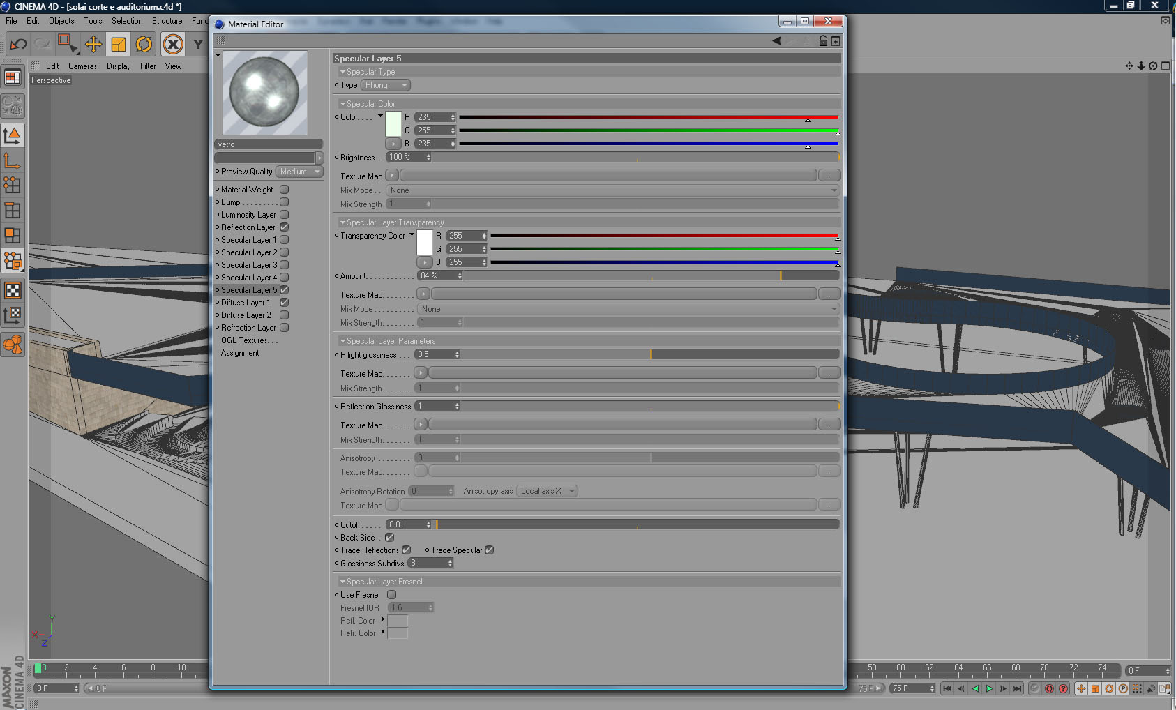 un diffusion al 92 di trasparenza e un reflection con fresnel oltre allo specular in immagine