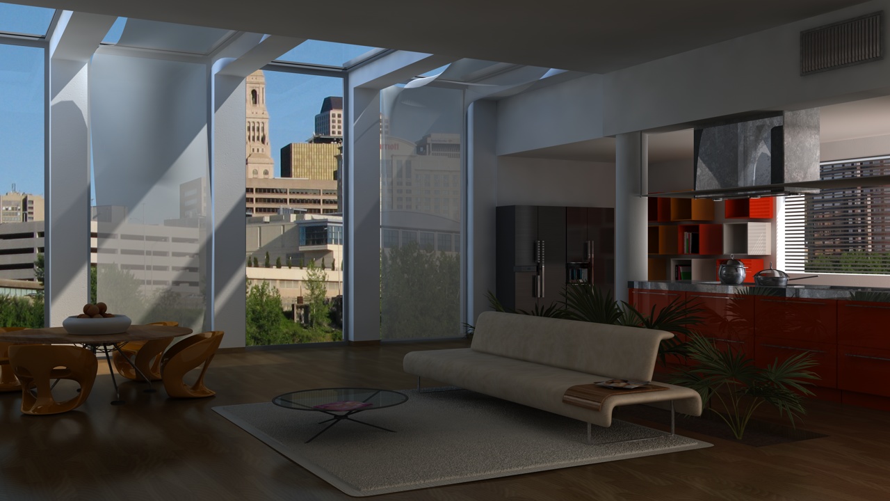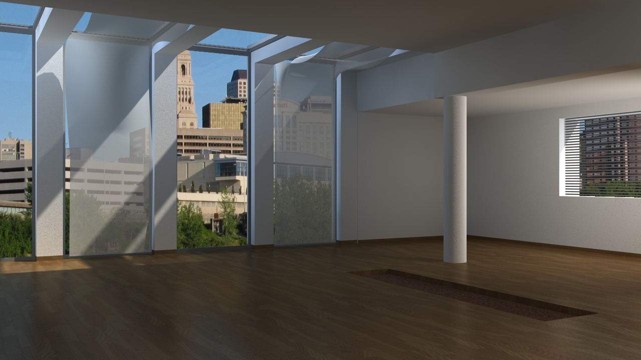 la foto fuori invece forse è meglio cambiarla del tutto, e' forse meglio usare o una panoramica applicata ad un piano arrotondato o 2 foto una per una finestra ed una per l'altra...questa cmq ha il sole in un altra direzione rispetto a quella dell'interno.