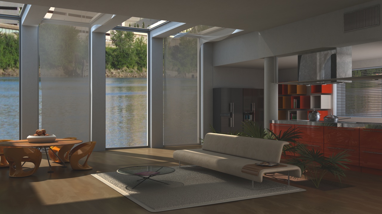 la foto fuori invece forse è meglio cambiarla del tutto, e' forse meglio usare o una panoramica applicata ad un piano arrotondato o 2 foto una per una finestra ed una per l'altra...questa cmq ha il sole in un altra direzione rispetto a quella dell'interno.