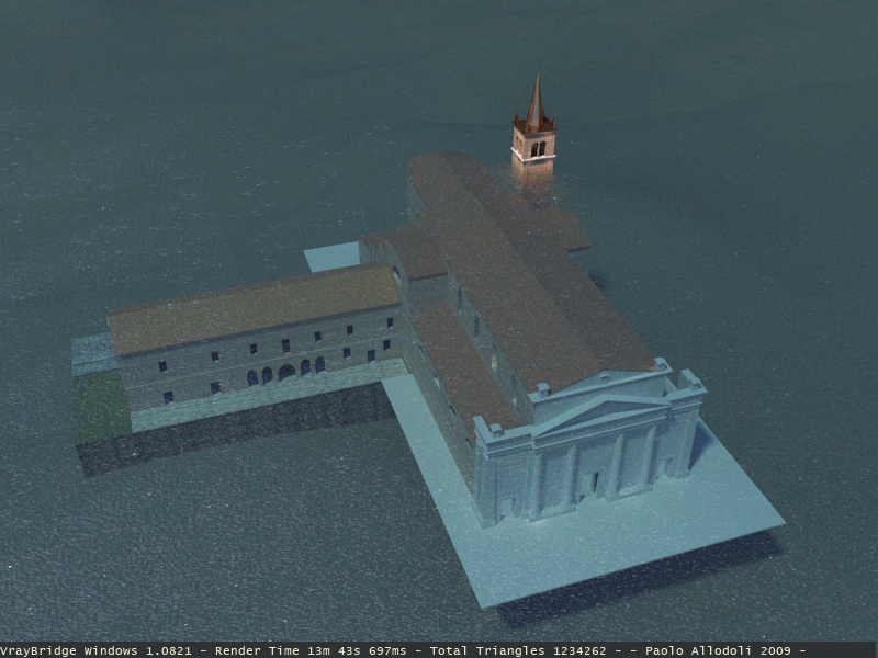 L' architetto è rimasto folgorato dalla pubblicità dei mondiali di nuoto di Roma (quella con i monumenti sott' acqua x intenderci http://www.youtube.com/watch?v=5wDaRu6g ... PL&index=3 ) e siccome dove sorge il monastero fino a 80 ani fa era pieno di canali (80 anni fa vi rendete conto?????? non ero nemmeno in cantiere io... non esisteva nemmeno goldrake....che tristezza, hi http://www.c4dzone.com/forum/posting.ph ... ost&f=2#hi hi) allora vuole una visualizzazione di quel tipo, solo che invece di vedere i monumenti da sott acqua la camera è all asciutto e la chiesa immersa.