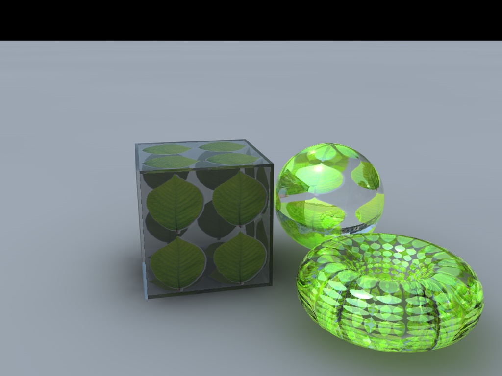Ciao, io non sono espertissimo ma ho voluto fare una prova ugualmente :D Nella sfera e nel toroide ho applicato un materiale tipo vetro, con una foto nel canale trasparenza ed ho giocato un pochino con la distanza di assorbimento sempre del canale trasparenza.