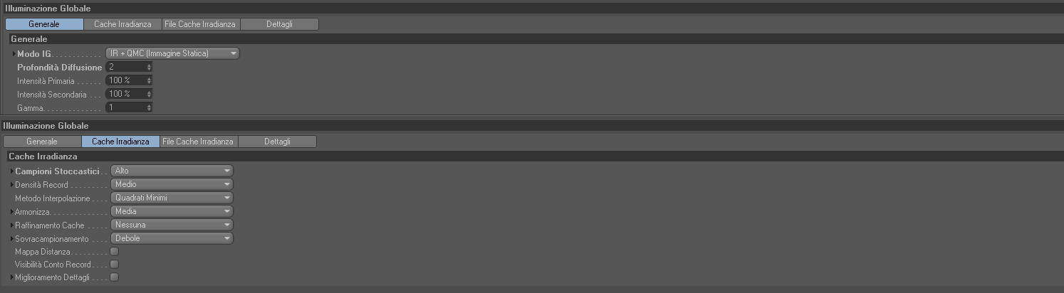 le impostazione di render invece, lascio la cache irradianza di default e nel generale profondità diffusione a 3/4.