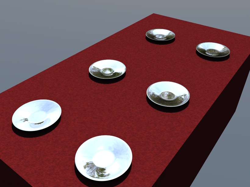credo che un fattore importantissimo che vedo manca... è la riflessione dei piatti che sembra dovrebbero essere a specchio... ma non hanno nulla da riflettere, devi scegliere una hdri giusta a seconda della composizione che vuoi ottenere e fargliela riflettere... questo per dare realismo alla scena