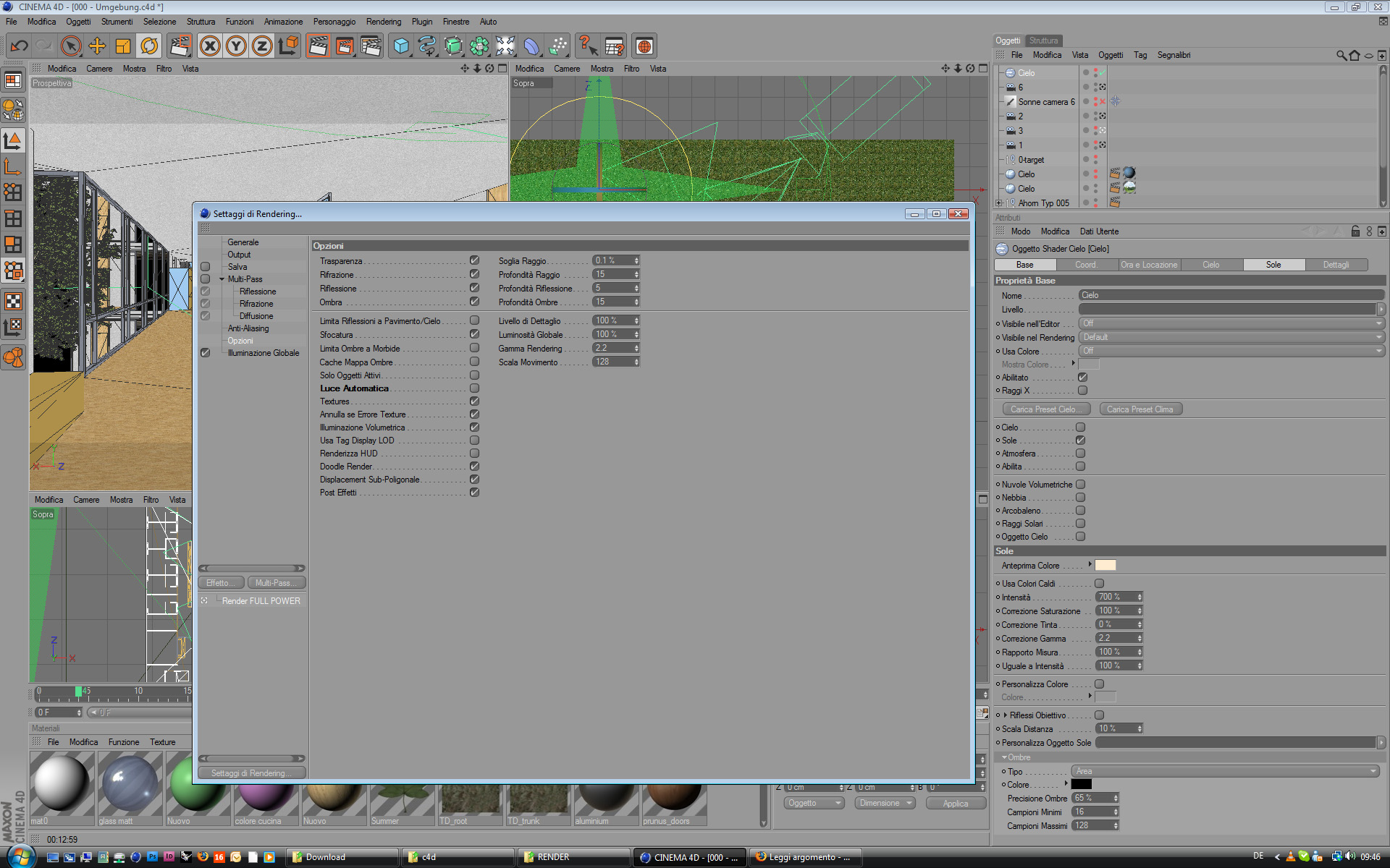 Vedo che in scena hai 2 cieli attivi uno è sky l'altro un cielo "normale", non è che assieme fanno dei casini? Poi se sky lo stai utilizzando solo per il sole, levalo e mettici una luce infinita e la luce irradiata dalla volta celeste falla fare all'altro cielo, che se non sbaglio lo stai usando per avere uno sfondo.
