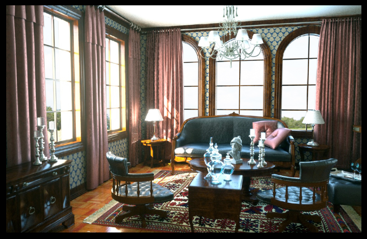 Ridurrei leggermente esposizione e glow. Ridurrei il bump del divano. Cambia la texture del pavimento che è troppo rossa.