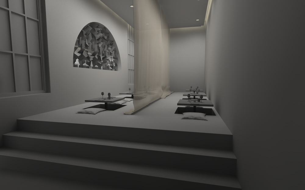 Ultimo up: la prima sala, quella grande, va ancora modificata, in fondo sull'angolo metterò il classico bancone da sushi, invece la saletta che si intravede sulla destra sarà la zona tatami...