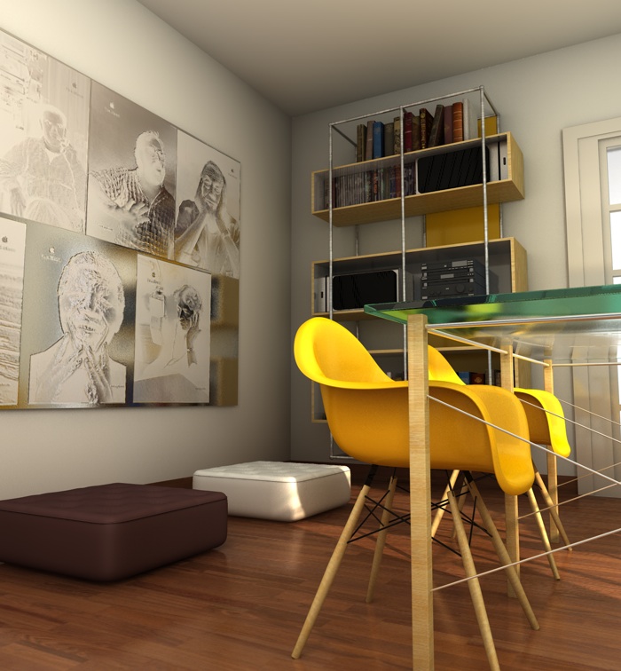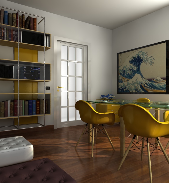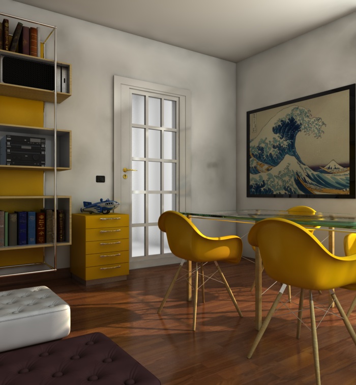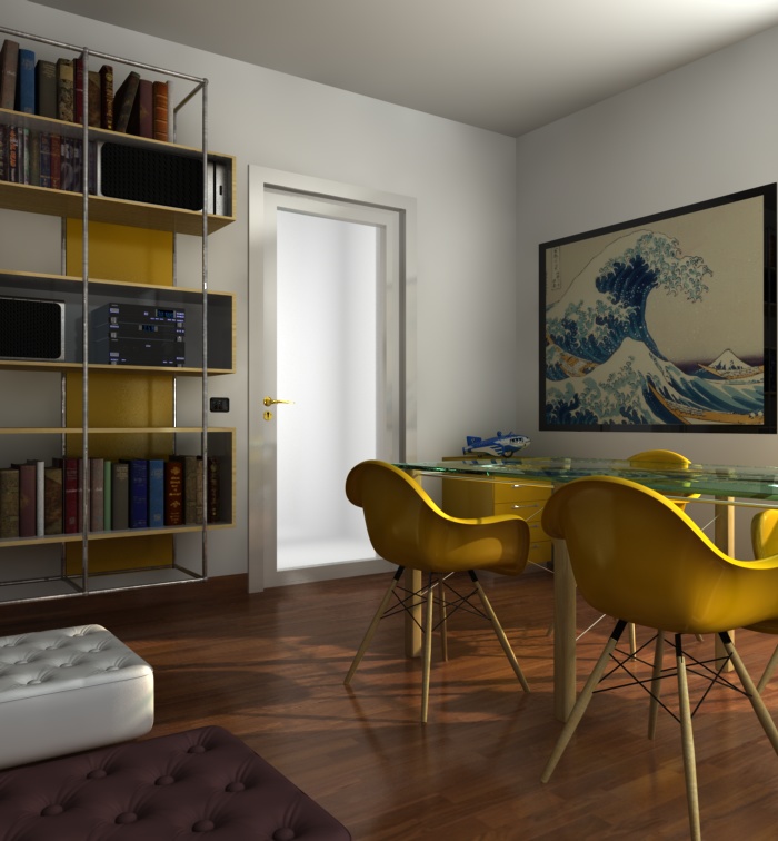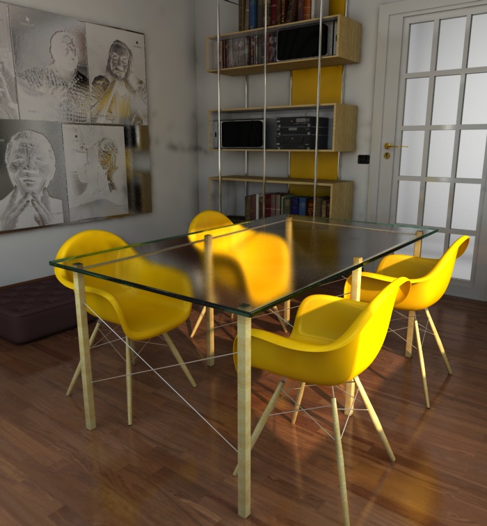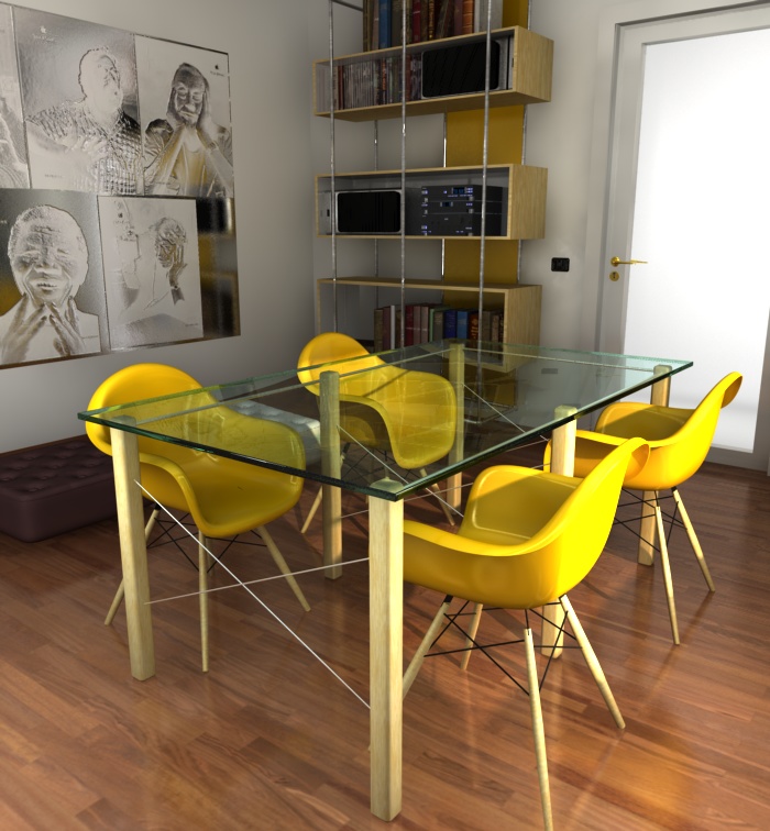 le uniche osservazioni che posso fare sono come è già stato sollevato, le gambe del tavolo toppo sottili, poi secondo me il piano del tavolo ha una "satinatura" che poco si addice a un piano. altra osservazione è la porta. la maniglia mi sembra troppo alta, normalmente una porta è alta 2,1 mt e la maniglia dovrebbe essere circa a 1 mt (come gli interuttori di fianco) .ultima osservazione sempre sulla porta, mi sembra costruita in modo strano. di solito l'anta con i vetri è tutta complanare. non dovebero esserci tutte quelle cornici.