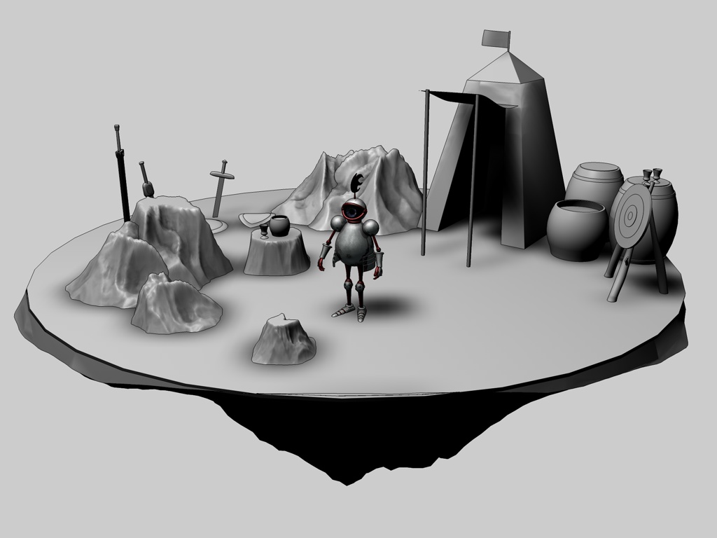 jeje devo dire che ho trovato questo topic molto divertente e dopo un po che ci pensavo ho pensato di postare questo vecchio progetto, il primo in assoluto fatto quando elderan mi fece conoscere cinema4d..wow.. niente è modellato..cioè era tutto boleane e aggregazione di solidi...jaja il personaggio era pesantissimo tipo un zilione di poligoni ed è l'unica cosa che ho leggermente ripreso..per l'isola beh meglio lasciare il passato dove stà cmq allego l'immagine come era stata concepita all'epoca (ho perso tutte le tex) e poi una singola del personaggio.