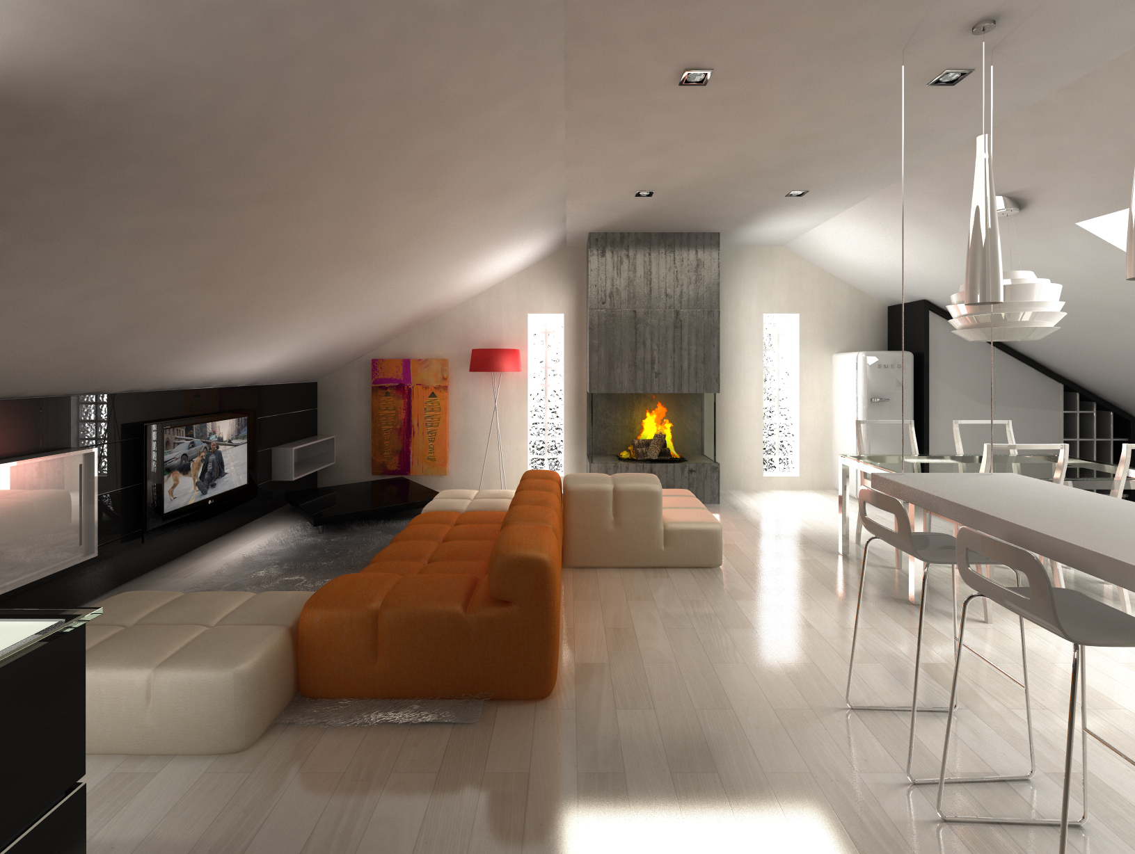 abbiamo anche dato un pò di riflesso del fuoco sul divano e messo una luce sulla sx nel piano di vetro,ed una a terra per dare un effetto al divano