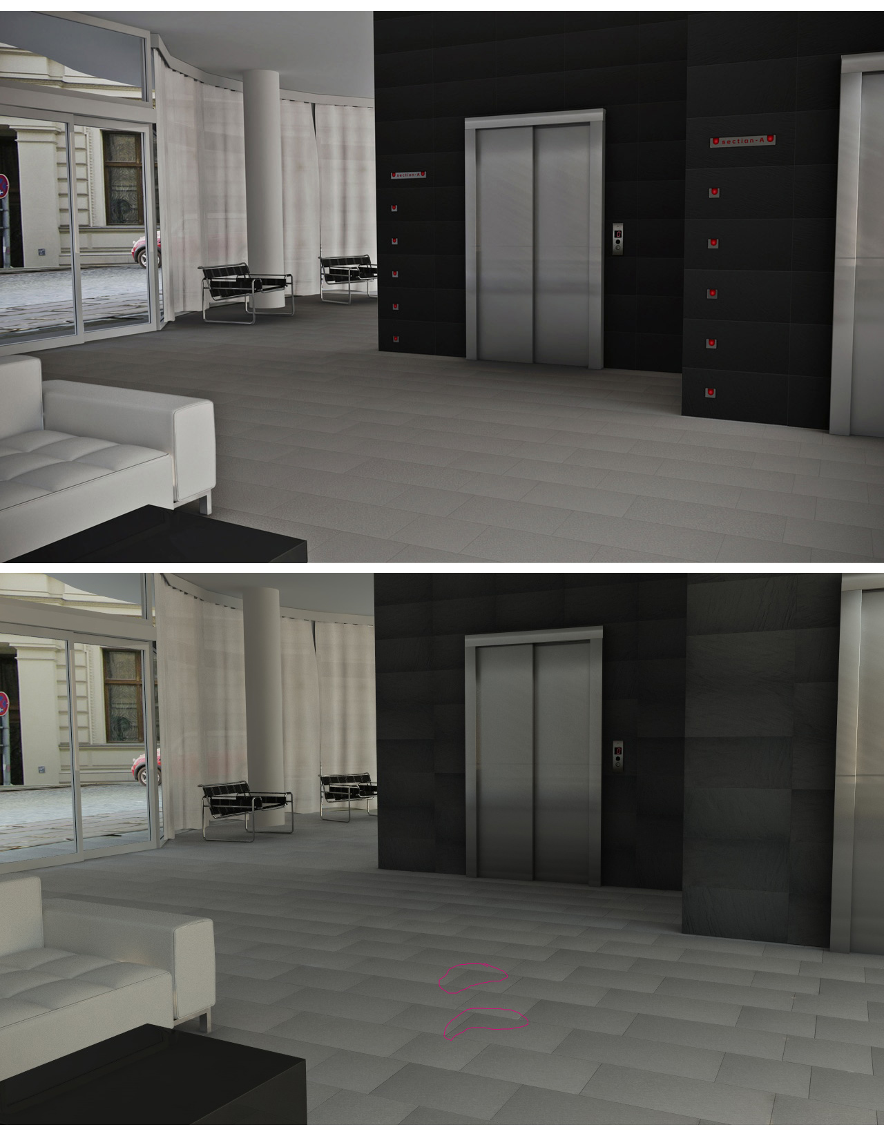 ho messo alcune delle texture che ho applicato alle piastrelle nella scena , si può notare che il dettaglio della texture originale sparisce non si percepiscono neache le rigature/striature , quindi la differenza e tanta !! nell'allegato con texture la prima scena in alto è il meglio che ho potuto fare esportando con il multipass i livelli e lavorandoli in photoshop ( perdendo un sacco di tempo )
