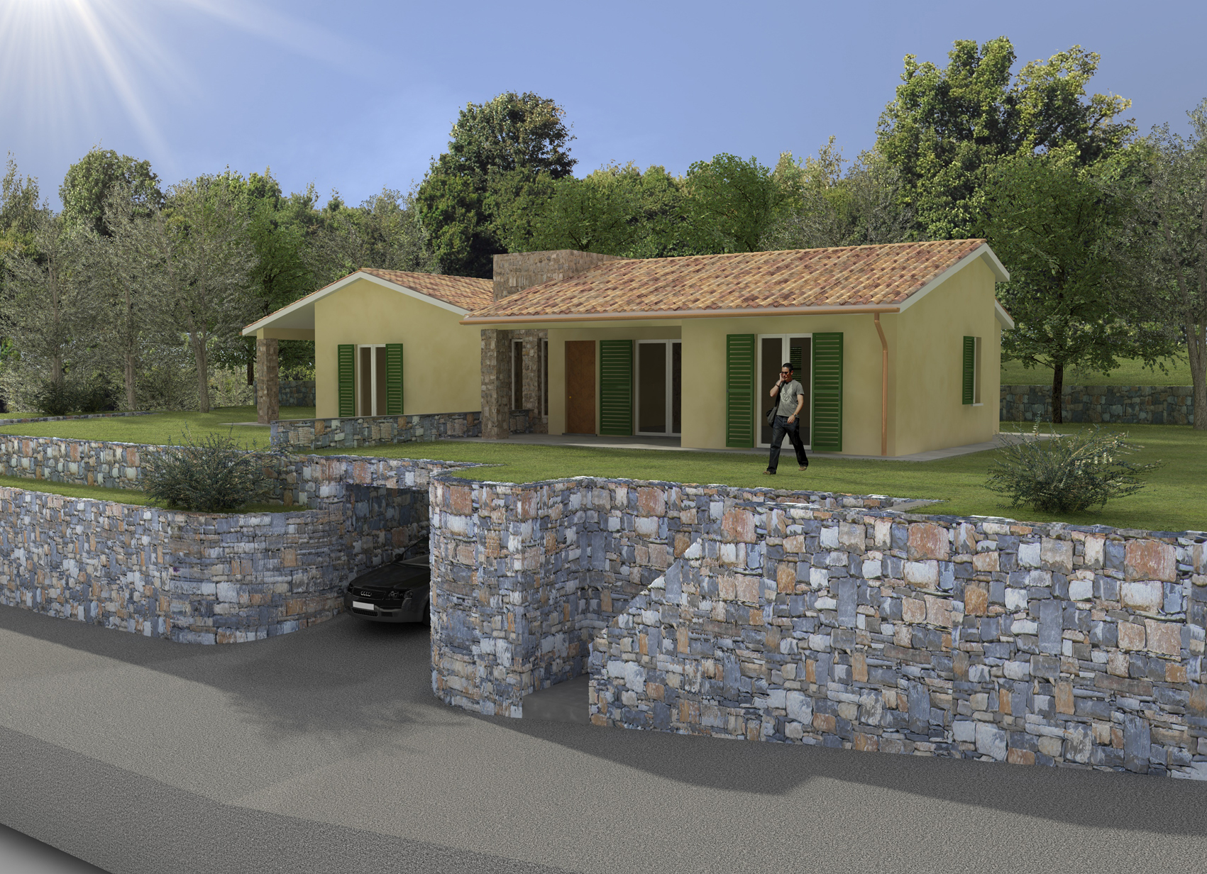 littlefox grazie per il tuo intervento: ho utilizzato questa pietra perchè sicuramente sarà questa ad essere utilizzata per il rivestimento dei muri, dovrei migliorarla in potoshop per renderla piu' accettabile, i coppi sono stati fatti con tuilegen e come dici tu dovrei scurirli col filtro di cinema per renderli meno evidenti nella composizione
