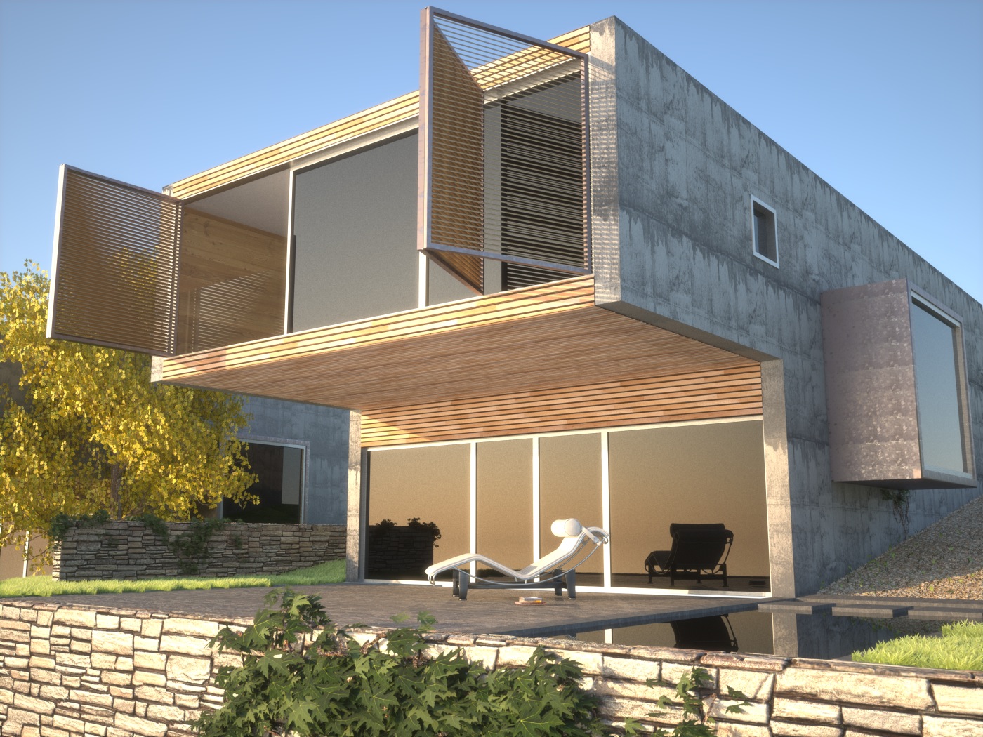 La trave a sbalzo che regge l'aggetto al primo livello, nel tuo render, viene interrotta dal parallelepipedo e questo non è possibile inquanto dovrebbe correre per tutta la facciata destra per poi fare lo sbalzo.