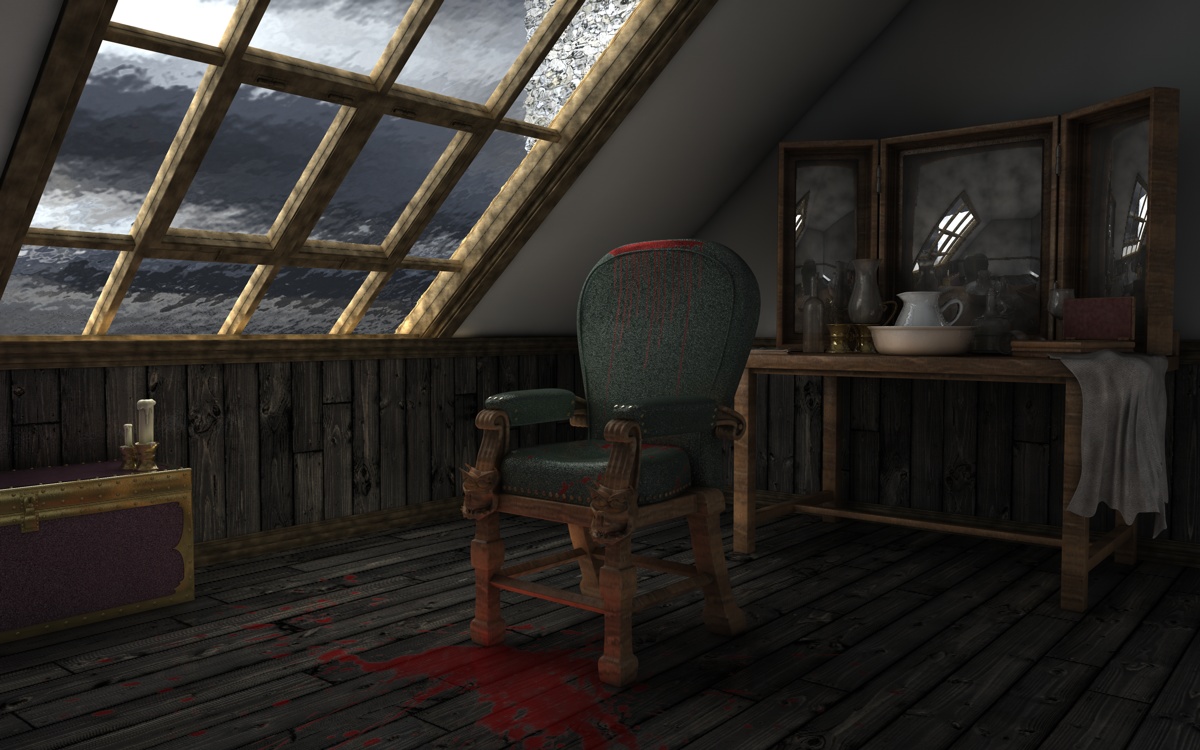 Ottimo. Hai provato ad inserire un pelo di moltiplicatore scuro? Che so, tipo 1.1? Così per provare, l'atmosfera è bella ma non vorrei diventasse troppo scuro agli angoli (zona angolo cassapanca o la zona vetri...). Poi dipende cosa ci vuoi mettere nel mezzo, perchè se tutto deve focalizzare l'attenzione lì allora va già bene così secondo me :D