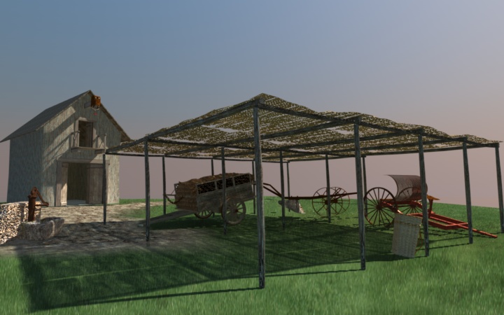 Una prima idea sulla composizione, sullo sfondo metterò un pannello, sulla destra degli alberi; materiali ancora da ottimizzare.