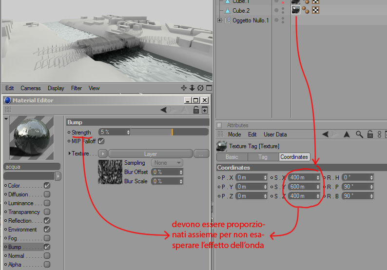 se inserisci l'intero tuo modello, camere comprese, ed imposti i valori di 0,01 per il ridimensionamento nei campi x-y-z, noterai che assegnado la mia texture dell'acqua avrai lo stesso mio risultato