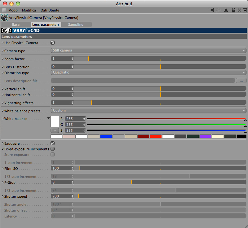 Ho riscontrato dei problemi con lo sfondo. Vray non mi renderizza l'Enviroment con caricata la foto di fondo utilizzando la VrayPhysicalCamera. Ho notato che invece lo sfondo viene renderizzato da Vary se utilizzo la camera standard di cinema 4D senza tag.