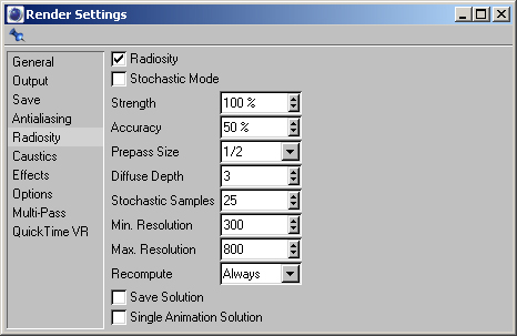 :) ciao, non so se la tua illuminazione sia corretta ma i tempi di render bassi sono dovuti al valore così basso di stocastic sample. E' da un pò che faccio prove come te e sono giunto a queste conclusioni: valori bassi di campioni stocastici (ma non così bassi secondo me) vanno bene per esterni dove le superfici esposte ad illuminazione diretta sono tante. Per interni dove la dominante è la luce riflessa o di rimbalzo sono necessari valori ben più alti di campioni (diciamo che il valore 300 di default è un buon compromesso anche se non sempre sufficiente). Per quanto riguarda i valori di risoluzione min e max partirei da valori più bassi perchè all'aumentare dei campioni questi fanno incrementare di molto i tempi. Spero di essere stato chiaro ma questa del radiosity è sempre una brutta gatta da pelare :?