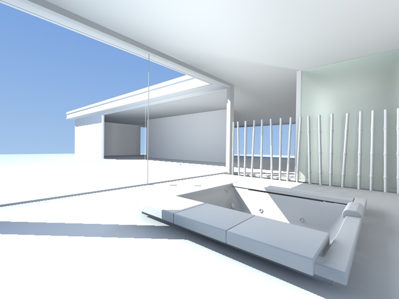 Le luci area le ho posizionate lungo tutta la vetrata a sinistra, lungo la vetrata in fondo (quella tra i due segni rossi) e una a destra dietro la parete, ma non sortisce l'effetto desiderato. Il prossimo step sarà posizionarne una dietro il vetro acidato...