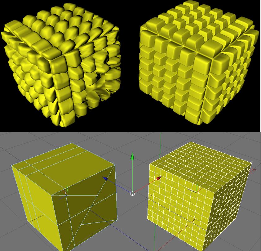 il displacement risente molto della pulizia della geometria sottostante: ti faccio un esempio per evidenziare il problema: a sx un cubo "macellato" da tagli indiscriminati e non continui; a sx un cubo con una maglia regolare. Puoi notare cosa succede.. la cosa migliora togliendo la spunta a distribuzione migliore (già proprio così!!) ma si nota comunque la differenza!