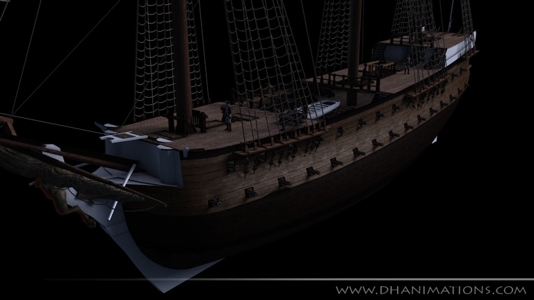 Added some more textures, re-worked the boat texture, fixed the ropes that hold the window hatches open, removed the basic blocks & added more & proper blocks. Made the lights, anchor & a couple more details. Added some randomness to the climbing ropes (as it was far too repetitive), made a diffuse channel for the ship & lastly i added the ships wheel.