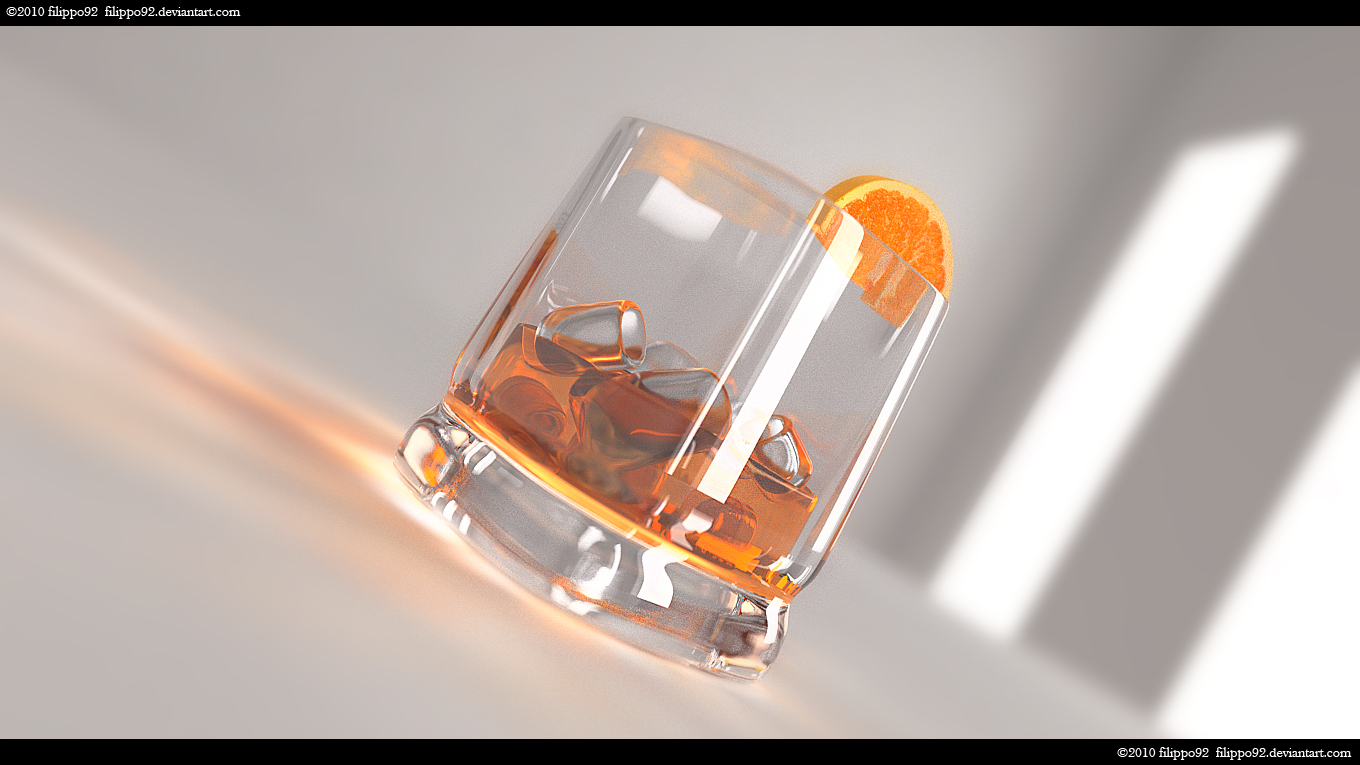 A meno che il tuo intento non sia quello di un bicchiere mezzo vuoto col ghiaccio già in parte sciolto, ma a questo punto l'arancio lo appoggerei su un piattino vicino (tipo sotto tazzina).