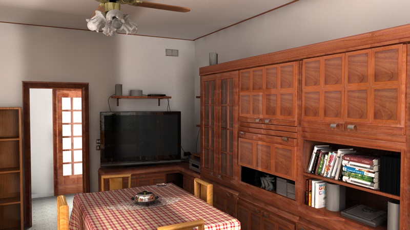 Ecco un primo render dell'altro lato della stanza . . . Manca ancora "qualche" dvd sullo scaffale a sinistra, quadro e lampadario nel corridoio e qualche ritoccatina alla texture della porta in fondo, cercando di evitare l'effetto della ripetizione della texture, e alla cassa del dolby in alto a destra sul mobile (non so perchè ma esce quella striscia nera).