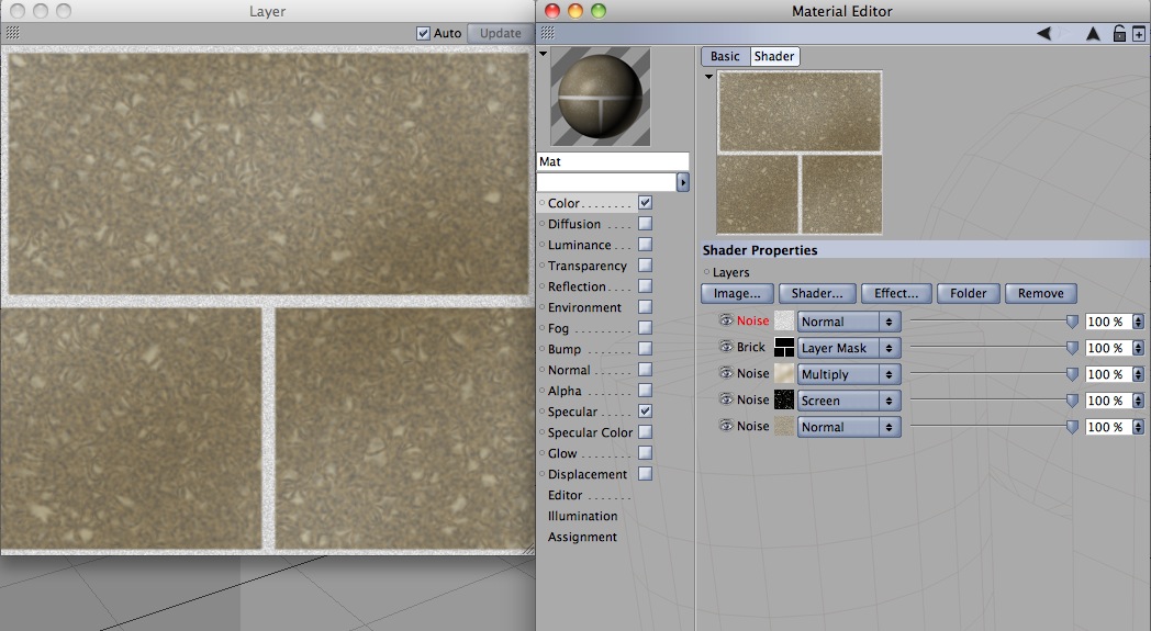 nel frattempo avevo seguito un'altra strada: creato il mio materiale nel canale colore con diversi livelli di disturbi per avere la trama che mi interessa, e nel canale alpha avevo messo il mio mattone affinchè mi tagliasse la pavimentazione.