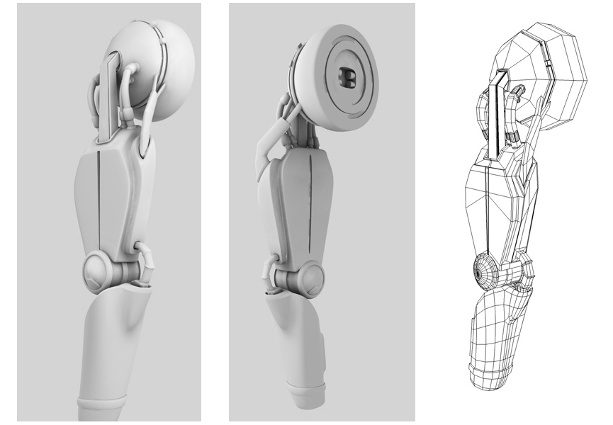 ho iniziato da poco a modellare il braccio....la parte di sotto è modellata partendo da un semplice cilindro,lo vedete al centro,e la parte di sopra con un box modeling,sempre andando con estrusioni :-)