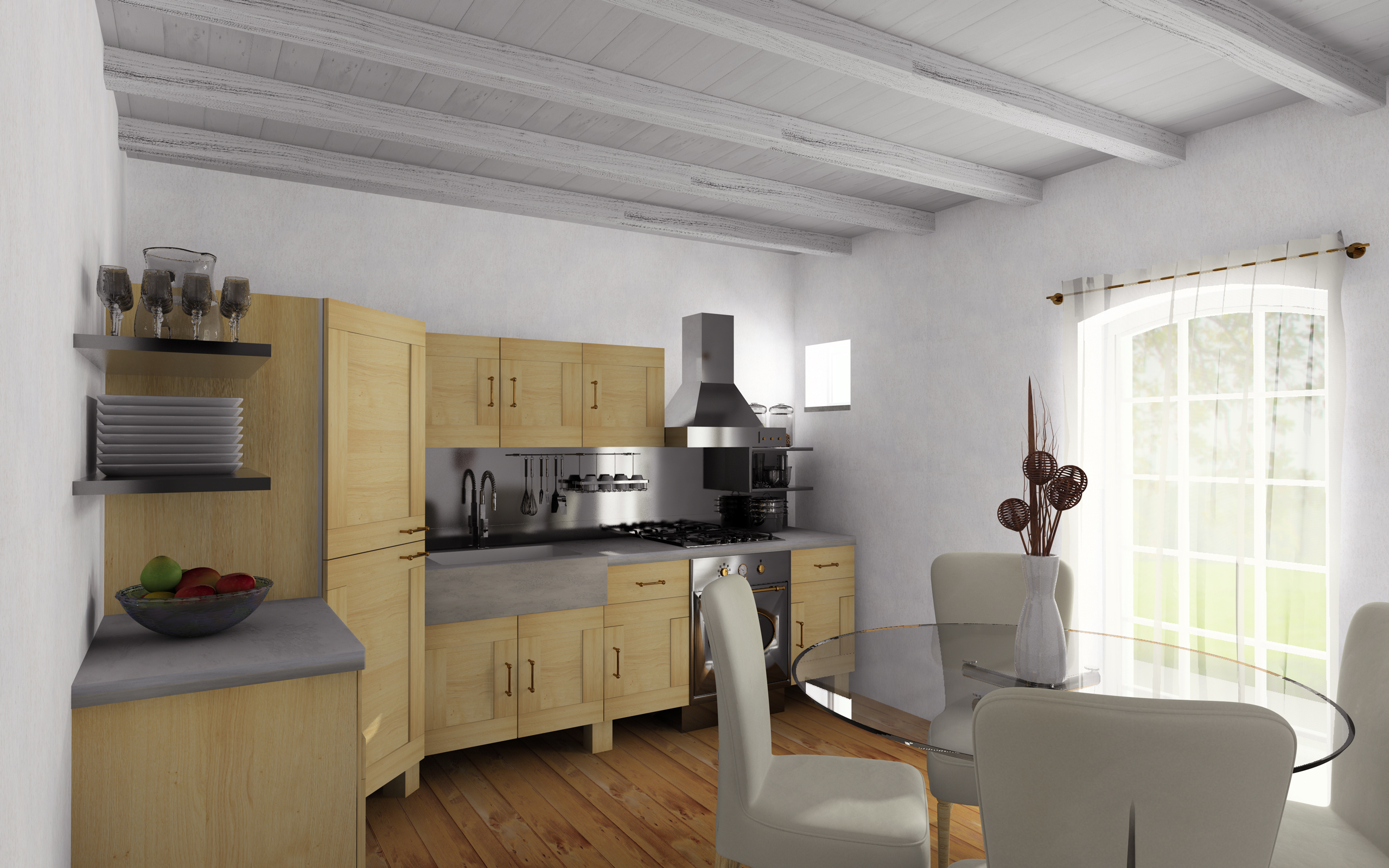 CUCINA: a parte il legno che sarà da cambiare perchè il capo lo vuole più scuro, e probabilmente anche il tavolo non sarà in vetro, la cappa da addossare al muro altrimenti i fumi non si sa dove finiscono, il materiale del lavabo: pietra o smalto? ne ho provati due simil pietra, uno con una leggera riflessione (nel particolare), l'altro senza (nella vista d'insieme)...and so on....MI SEMBRA PIATTISSIMA! ci sono due luci area alle finestre con intensità 100% quella grande, 50% quella piccola, e una luce infinita 300% a simulare il sole...parametri GI: diffuse depth 3, primary intensity 200%, secondary 150%, gamma 1...