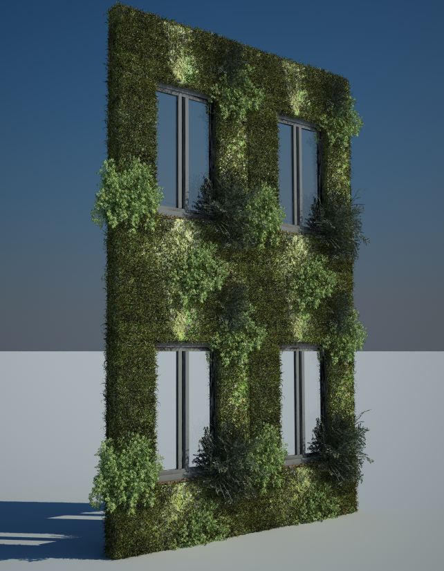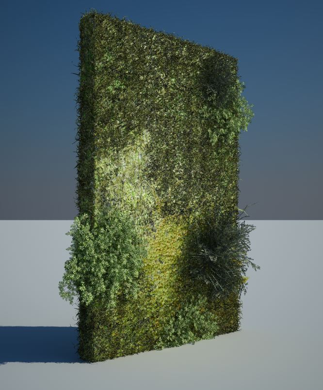 Puoi usare un misto tra ivy generator, mischiato con dei cespugli ruotati, alberi immersi dentro la parete (con i punti non visibili cancellati), textures, photoshop, ecc ecc.