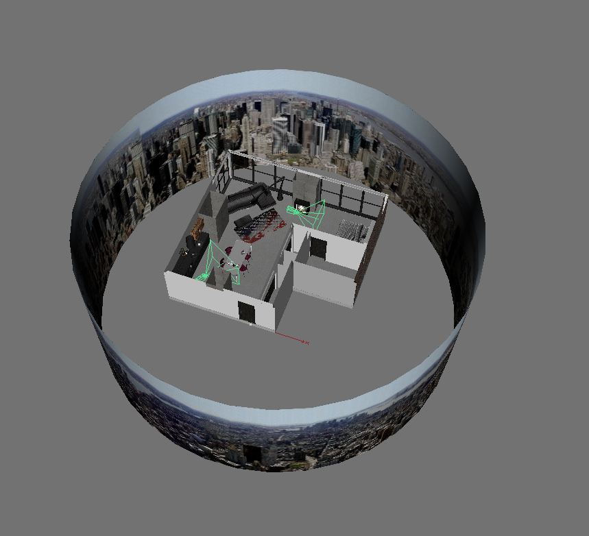 certo, il procedimento è molto semplice, in questo caso ho usato un immagine panoramica (come spesso faccio), applicata ad un cilindro, al materiale ho attivato la luminanza e le luci area alle finestre sono double sided, così illuminano anche l'immagine
