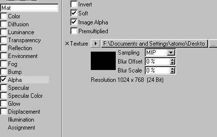 nuovo materiale e con il solo canale alpha attivato (vedi img all.) carichi il file precedentemente creato in photoshop.