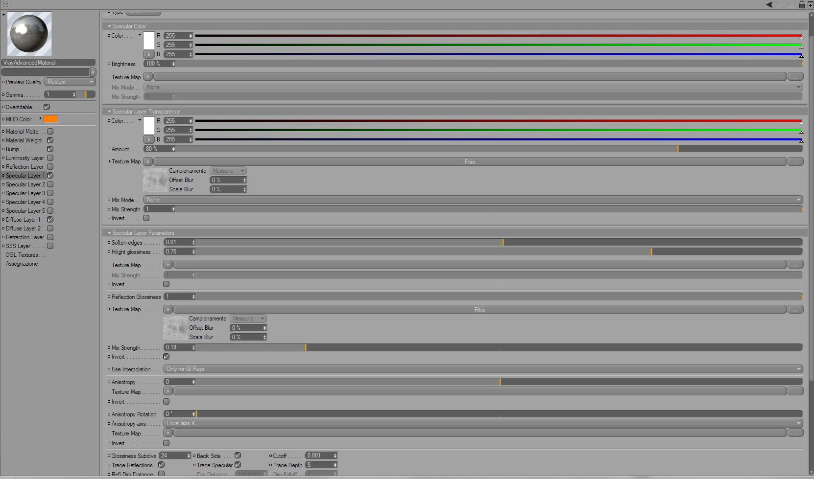 -specular>specular color lo stesso colore ma più chiaro, IOR intorno a 2,5, glossiness intorno a 0,9, subdivision 32