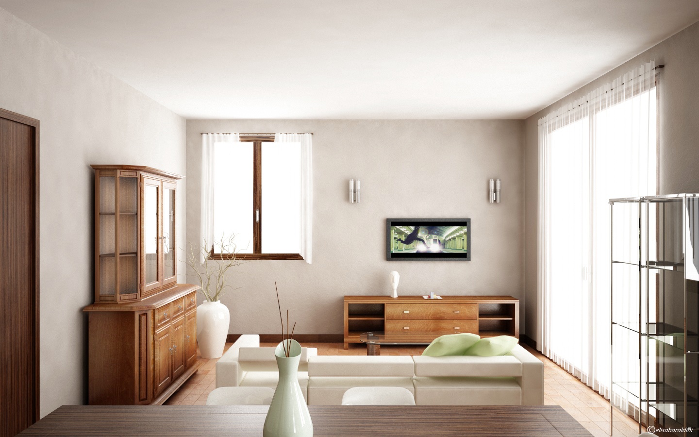 Se posso, un paio di considerazioni: la finestra frontale secondo me è troppo luminosa, salta subito agli occhi e distoglie l'attenzione dalla composizione; proverei a mettere uno sfondo dietro anche molto esposto ma giusto perche' non ci sia quella toppa bianca. Altra cosa ormai che ci sei
