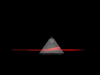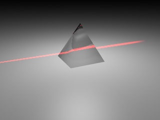 Ti occorrono 2 luci: la prima è quella che genera il laser che penetra nel prisma (attiva però la decadenza e falla terminare all'interno del prisma). La seconda luce spot (o tubo?... forse meglio) parte dall'interno del prisma e fuoriesce... ovviamente debitamente "deviata" (l'inclinazione te la suggerisce la rifrazione del materiale del prisma).