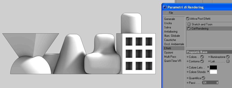 Comunque più semplicemente puoi anche provare attivando nei post effetti (parametri di rendering) cel-rendering, con un sufficiente n° di passi in quantifica. Poi come giustamente accennato, l'effetto è affidato alla luce e G.I.
