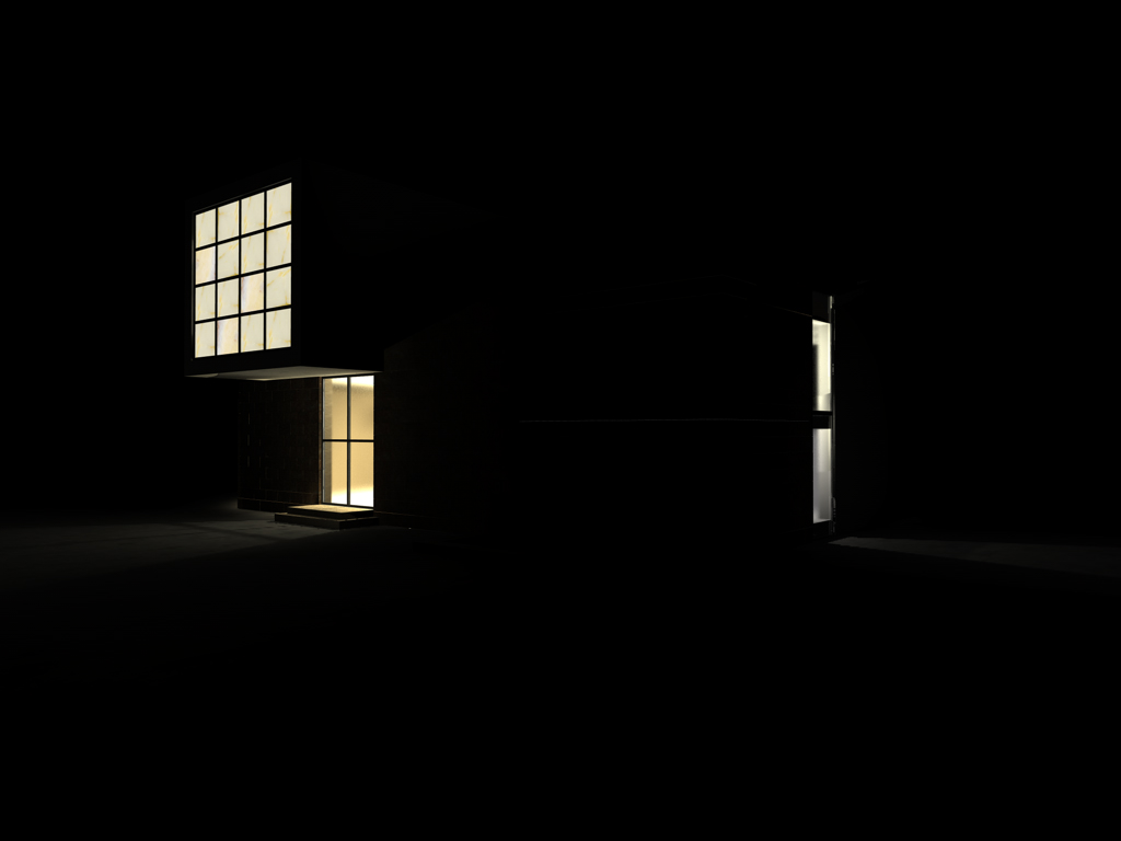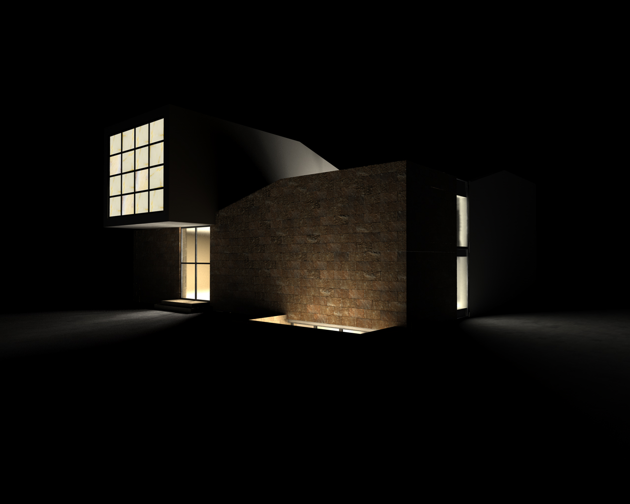 - un'ombra spot che da dentro illumina l'esterno passando attraverso la porta (intensità 120%, shadow maps soft, decadenza lineare che tocca la pavimentazione esterna)