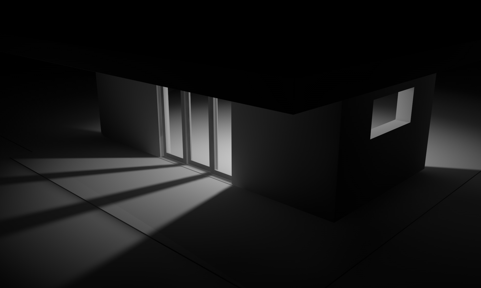 - uno spot che da dentro illumina l'esterno passando attraverso la porta (intensità 122%, ombre area, decadenza lineare che tocca la pavimentazione esterna)