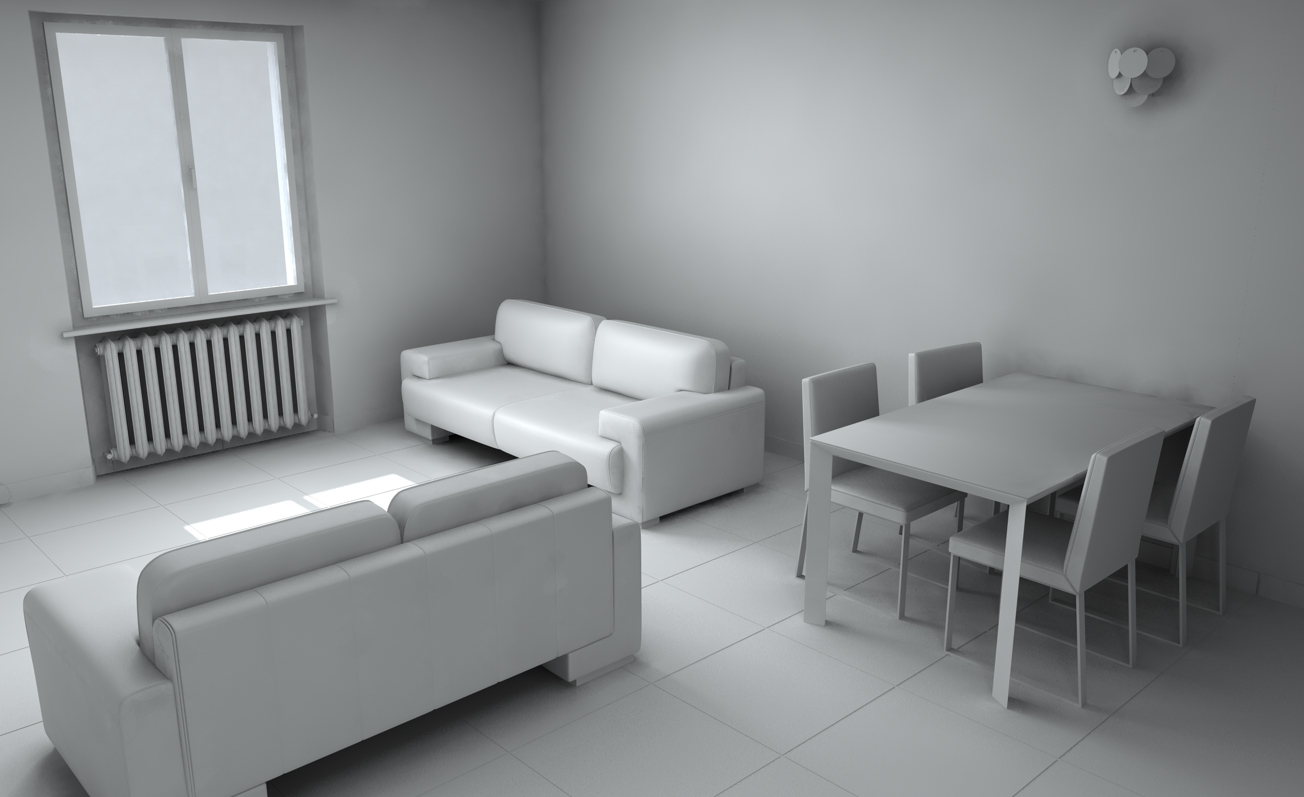 - luce area (dietro il divano parallelo alla finestra c'è la porta della cucina), intesità 60, ombre area e dacadenza lineare