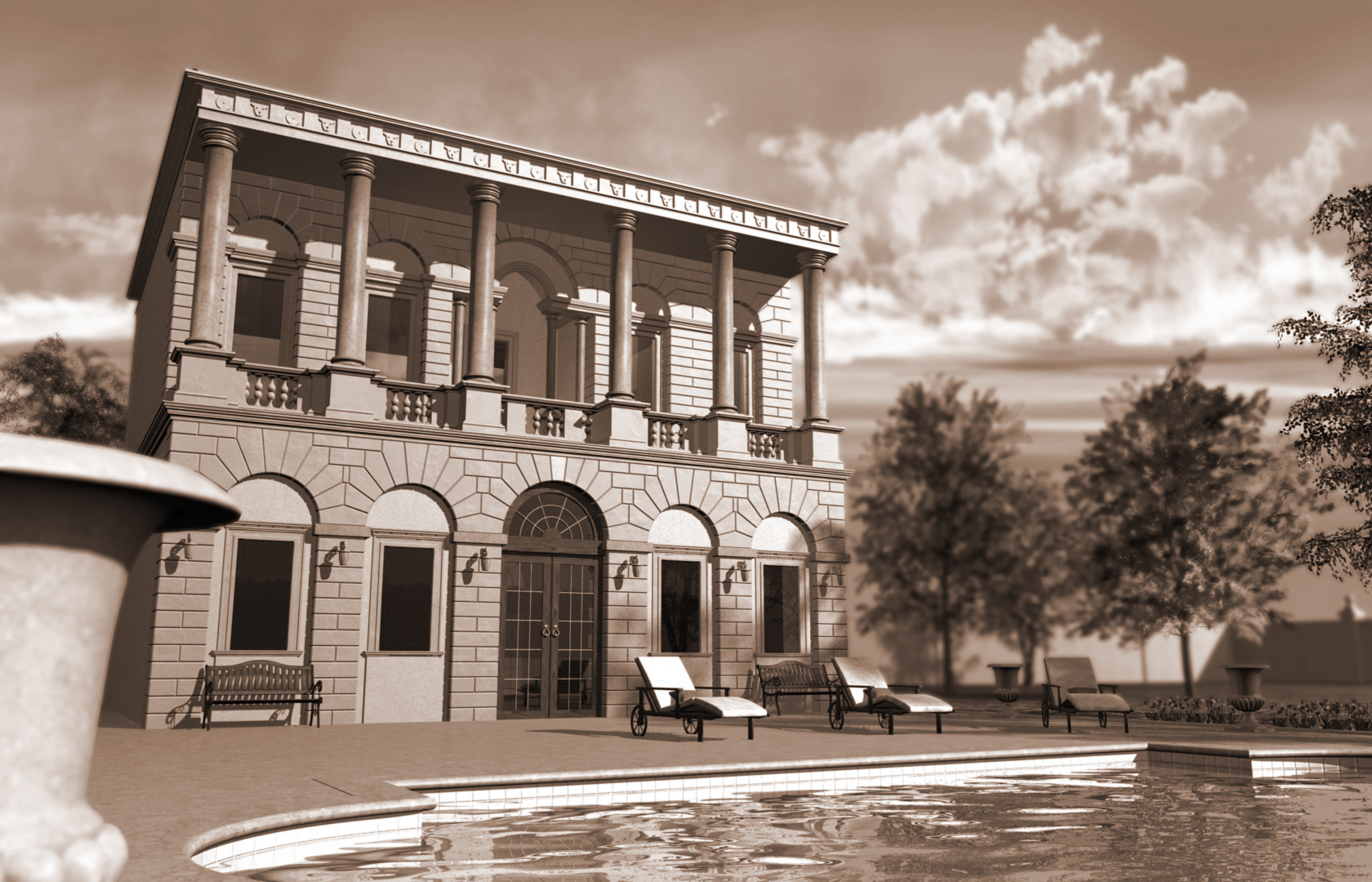 - la vasca d'acqua mi sembra venuta bene e se la villa si specchia dentro sicuramente viene un bell'effetto. (quindi alzarsi poco poco).