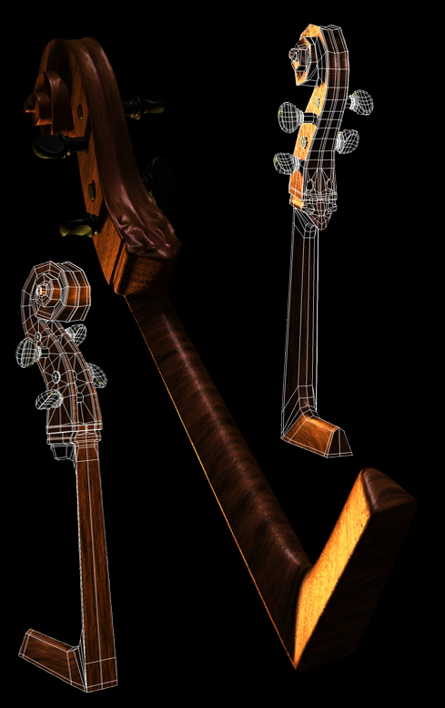 Ho pensato parecchio alla questione del manico e del ricciolo come pezzi separati o meno, e la soluzione che mi suona tecnicamente più comoda e comunque efficace nell'insieme è di avere due mesh distinte.