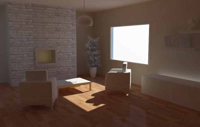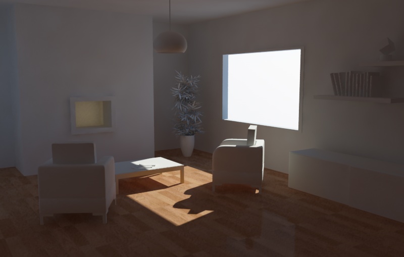 Ora ho messo la polvere(Turbidity) a 2, ho messo delle luci area alle aperture, una alla finestra e una a sinistra sul muro(non si vede ma c'è un'altra apertura). Quella alla finestra non ha decadenza e ha intensità a 2, quella a sinistra ha intensità 1.7 e decadenza ed ha un colore un po' più freddo dell'altra(perchè la luce è come se venisse da un'altra stanza). Ho messo la saturazione della GI a 1.7 e il contrasto a 0.9. Ecco il risultato: