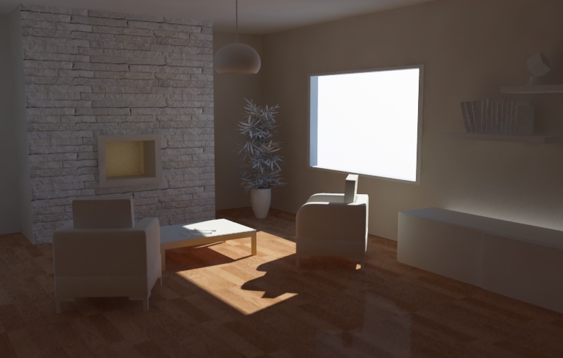 allora,metti una camera e il ph cam con valori di default,metti il sole e luci area con decadenza in corrispondenza delle finestre