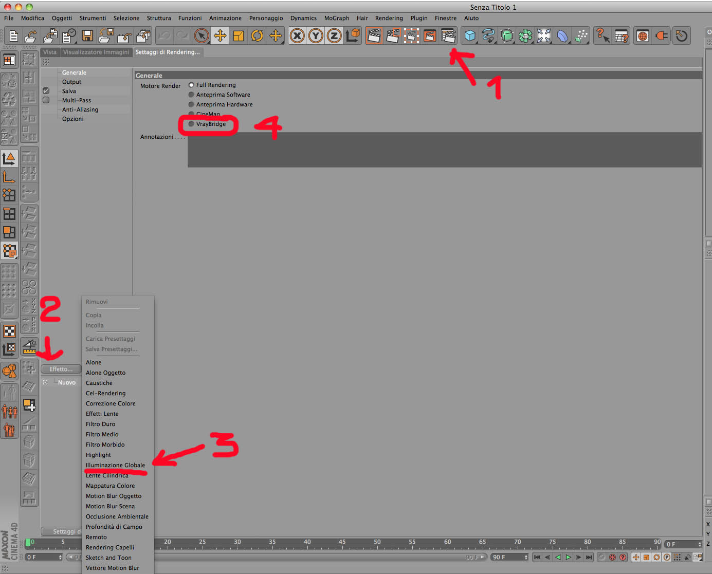 Quando entri nei settaggi di rendering (1) hai la possibilità di scegliere l'effetto (2) che vuoi dare al tuo rendering. Se tra gli effetti hai installato anche "illuminazione globale" (3) comunemente detta GI allora vuol dire che nel tuo cinema 4D è installato Advanced Render, un motore di rendering aggiuntivo sempre prodotto dalla stessa casa che fa cinema. Oltre a questo è possibile aggiungerne altri. Tra i migliori e più comuni ci sono vray (4) e Maxwell Render che trovi sull'impostazione "Generale".