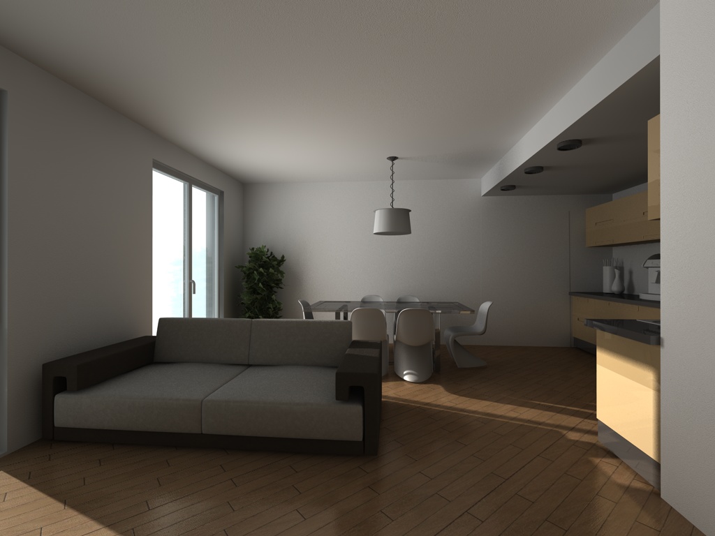 beh,molto diverso!!magari dai un intensità maggiore alla luce e arricchisci un po la stanza che mi sembra molto povera.dopodichè darei anche un aggiustatina ai materiali,come quelli del divano che non si capisce che mat siano(forse sarò io che nn li capisco,nn so :) )
