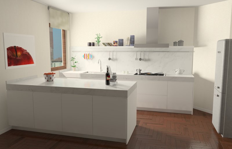 Non ho avuto tempo di ri vedere quel rendering, (la cucina l'ho venduta comunque) spero di trovare un momento per migliorarla, però ne ho fatta un'altra usando le impostazioni delle luci area della prima, ma un po' meno gialle e usando un celo + HDRI e una luce sole alle 10 in luglio. Ho messo anche un filtro duro al 10% (so che non è il massimo ma mi aiuta nei chiaroscuri).